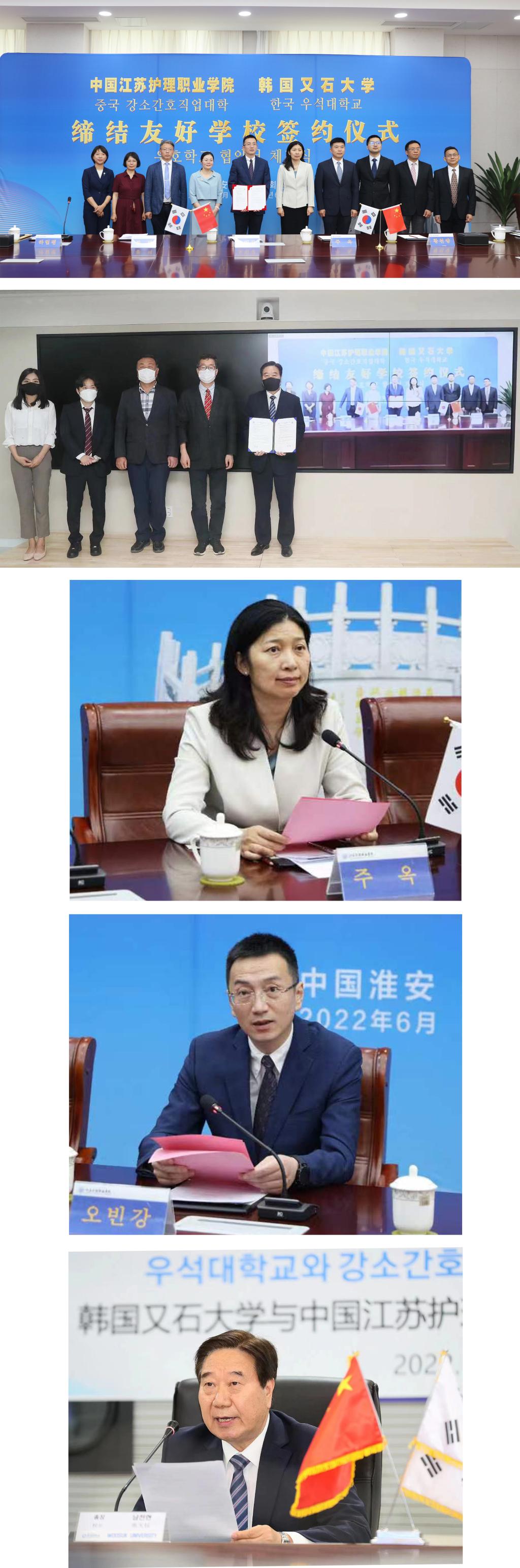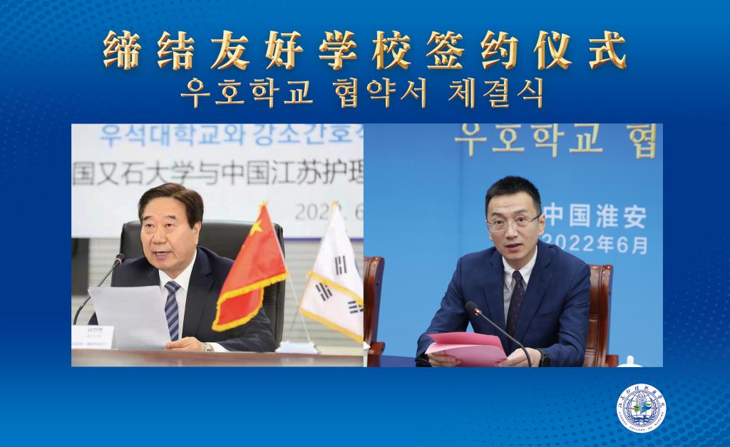 6月9日,beat365与韩国又石大学举行缔结友好学校线上签约仪式。beat365中国官方网站党委副书记、院长吴彬江,韩国又石大学校长南天铉,淮安市外办主任、市友协副会长朱钰,副主任黄天亮,beat365中国官方网站党委委员、副院长夏立平,党委委员、组织部部长夏前正,韩国又石大学副校长、国际交流院院长、康复学教授金东柱,学校相关部门负责人,市外办相关部门负责人参加活动。