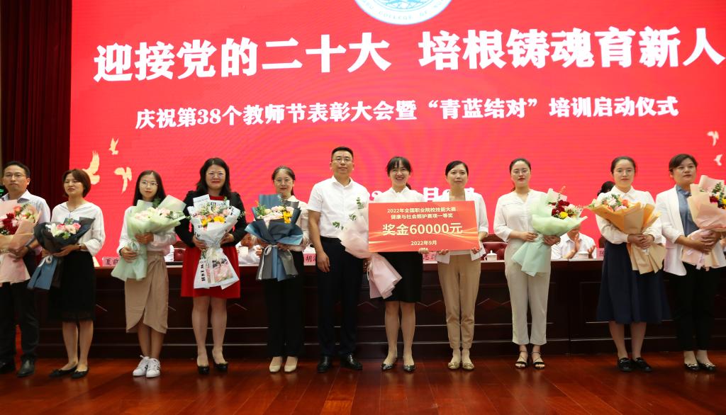 大会分别为国赛一等奖团队、优秀教师和优秀教育工作者颁发荣誉证书,为“青蓝结对”指导老师代表、新教职员工代表颁发聘书。