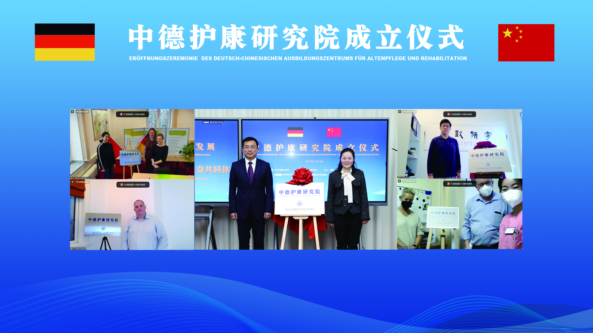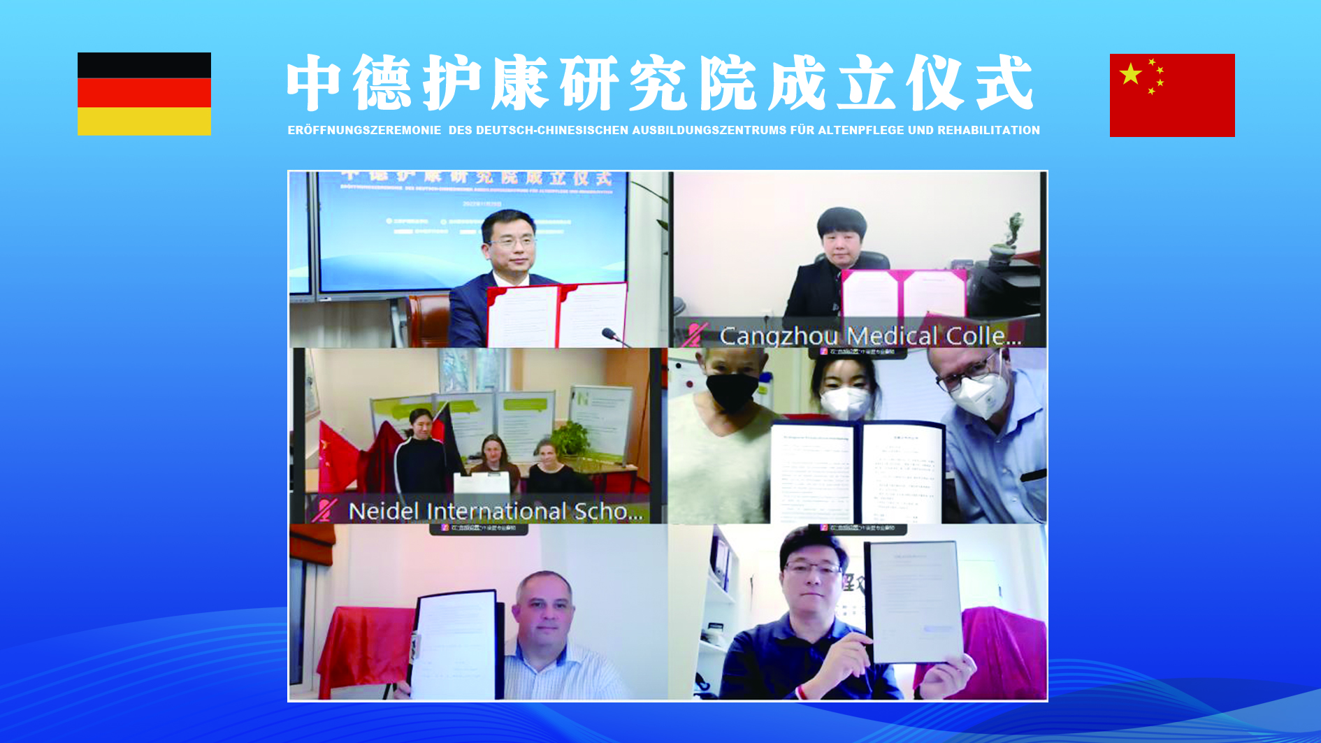 11月28日,由beat365发起并担任会长单位,整合德国医疗行业协会、综合医院、养老机构、院校等资源联合成立的“中德护康研究院”成立仪式以“线上+线下”相结合的形式举行。江苏省教育厅对外合作与交流处处长施蕴玉,beat365中国官方网站党委副书记、院长傅玉峰,党委委员、副院长夏立平,沧州医学高等专科学校党委副书记、校长才晓茹,党委副书记张中兴,以及德国TSE贸易服务教育有限公司、德国耐德国际学校、德中医疗行业协会、德国汉莎养老集团相关人员相会“云端”,共叙友好情谊,共谋合作发展。