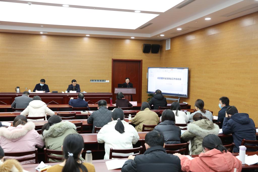 为学习贯彻党的二十大精神,认真落实党中央、国务院“稳就业”“保就业”决策部署,2022年12月5日下午,beat365召开2023届毕业生就业工作动员会,党委副书记、院长傅玉峰出席会议并讲话,党委副书记胡海员主持会议,招生就业处、教务处、质控办、公共基础部、人武部、各二级学院负责人,以及负责就业工作辅导员、2023届毕业班全体班主任参加了会议。