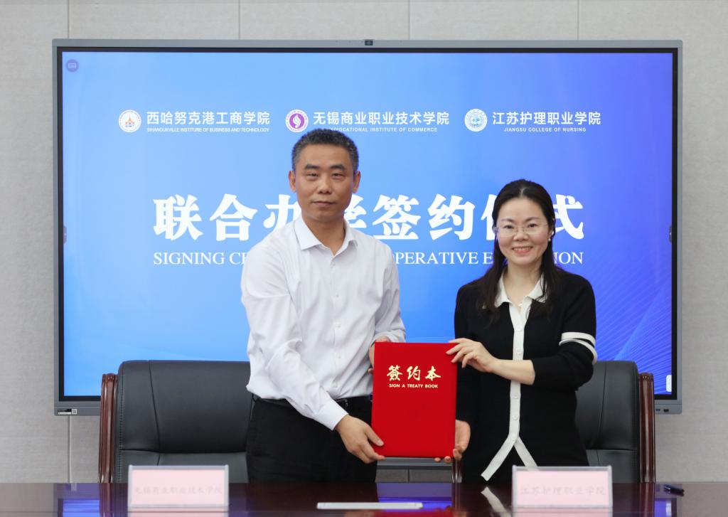 4月20日,beat365与无锡商业职业技术学院、柬埔寨西哈努克港工商学院举行联合办学签约仪式。学校党委副书记、院长傅玉峰,党委委员、副院长夏立平,党委委员、组织部部长夏前正,党委委员、宣传统战部部长朱郁草,无锡商业职业技术学院党委委员、副院长朱璋龙,党委委员、宣传部部长叶东出席签约仪式。