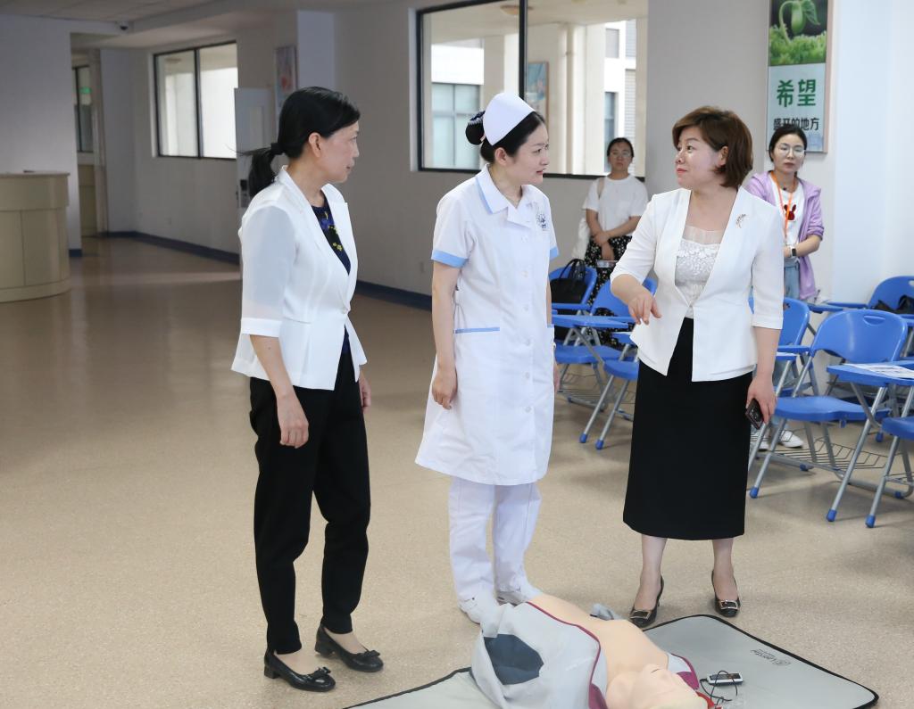 6月9日,淮安市民政局局长李萍,市总工会副主席张修和,市人社局四级调研员、系统工会主席许广汉一行来beat365考察指导美国心脏协会(AHA)急救培训中心建设工作。校党委书记陆志群,校相关部门负责同志陪同考察。