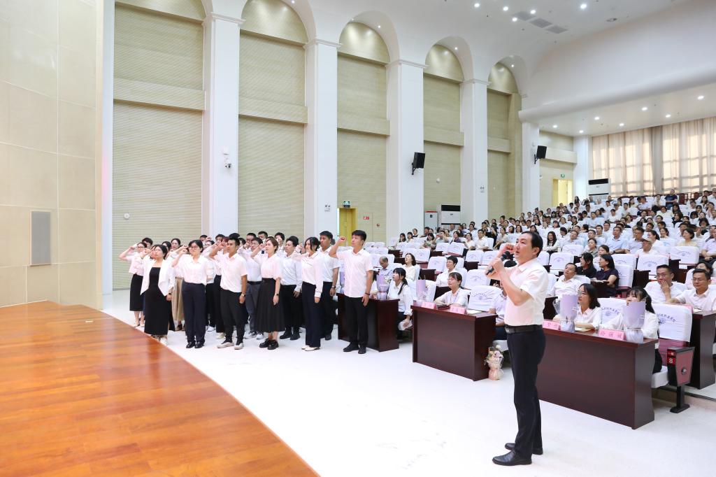 优秀教师代表唐蕾博士在会上发言。新任教师进行了入职集体宣誓。
