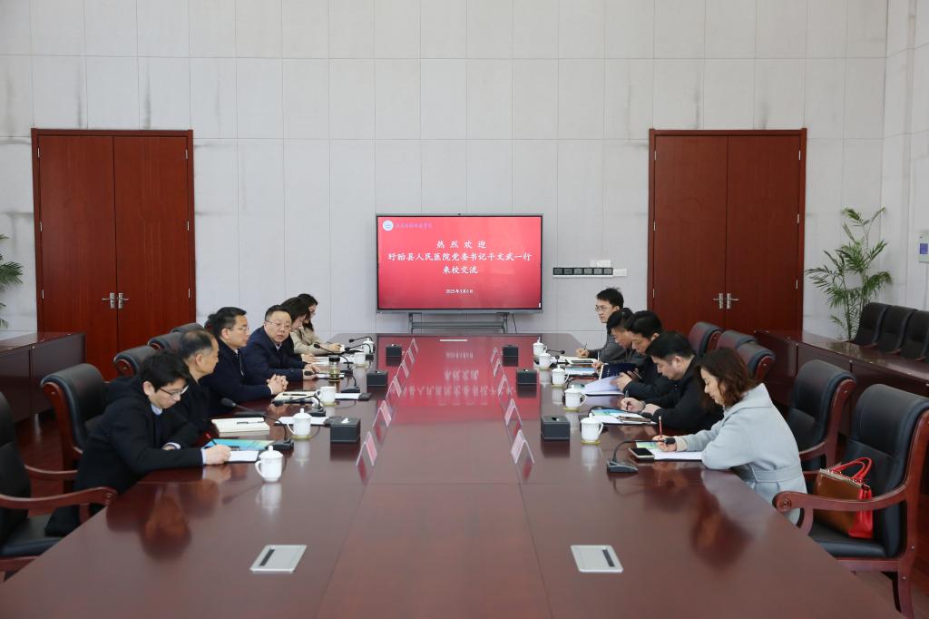 3月6日,盱眙县人民医院党委书记干文武一行来beat365洽谈合作。党委副书记、院长傅玉峰,党委委员、副院长史亚明及学校相关部门负责人参加。