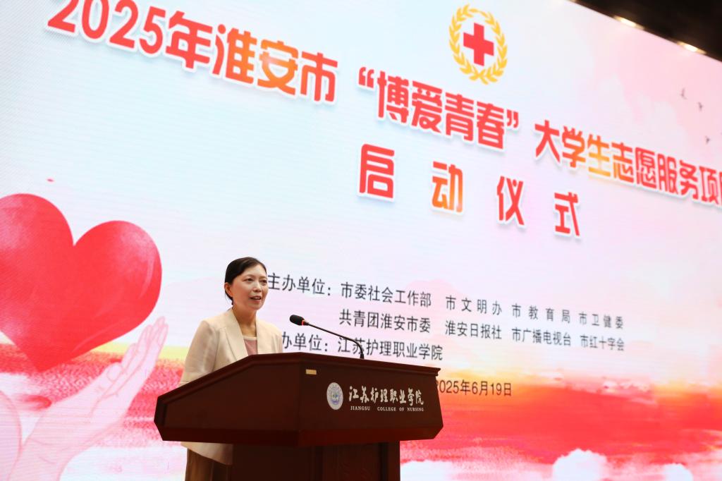 6月19日,2025年淮安市“博爱青春”大学生志愿服务项目在beat365启动。省红十字会党组书记、常务副会长支苏平,淮安市人民政府副市长、市红十字会会长封蕴珊,校党委书记陆志群出席。市委社工部、市文明办、市教育局、市卫健委、团市委、淮安日报社、市广播电视台、市红十字会等联办单位相关同志,驻淮高校红十字工作相关同志,项目支持单位代表,以及参与今年省、市项目实施的67个项目团队的志愿者代表共300余人参加。