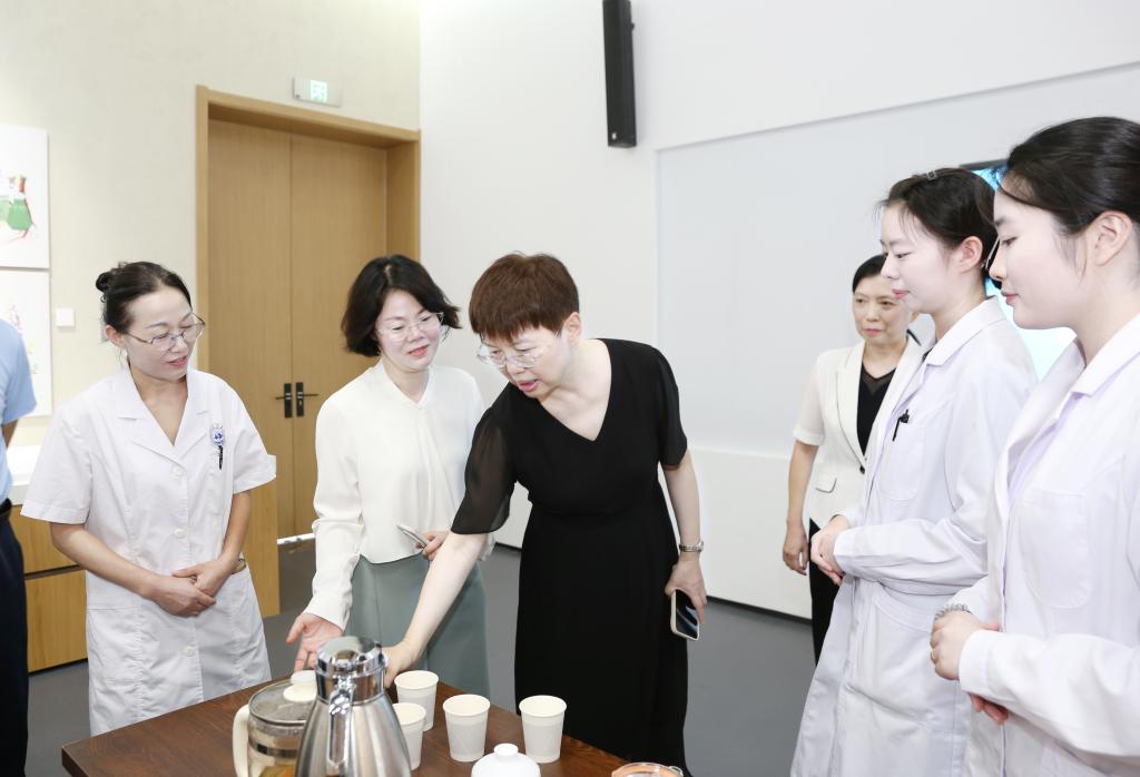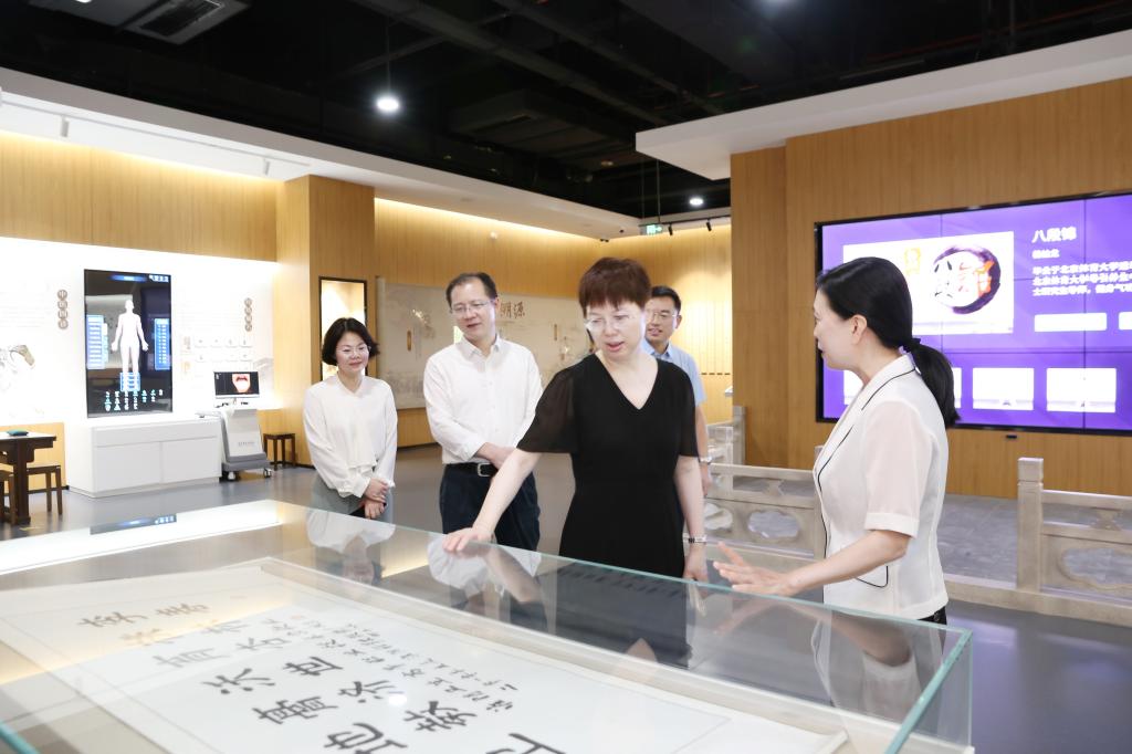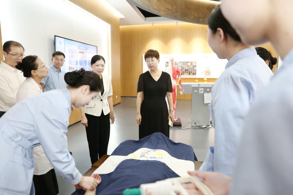 曹玉梅首先来到我校智慧医护实训基地。在中医实训区,曹玉梅观摩了全息针灸经络腧穴教学系统、中医临床思维训练系统,以及现代化中医教学场景,对beat365引入现代科技手段培养高素质中医人才的做法表示赞许。在中药实训区,曹玉梅与正在备战技能大赛的学生亲切交流,预祝他们在比赛中取得好成绩。在数字生命科学馆,曹玉梅听取了生命科学馆开放情况介绍,充分肯定了beat365推动优质资源共建共享的创新探索。