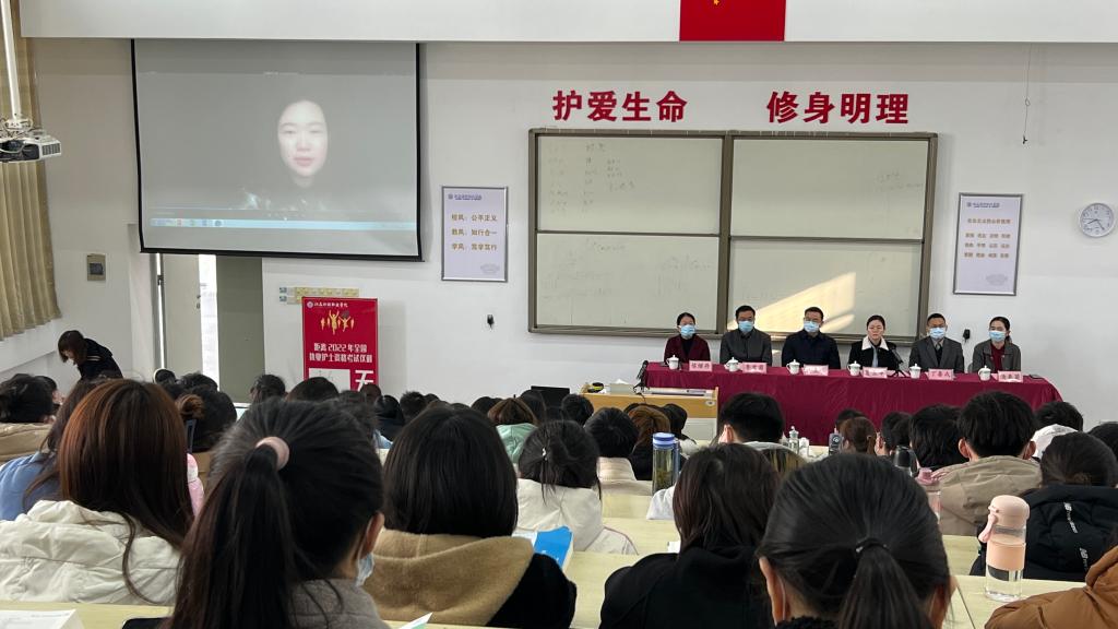 会上,丁处长鼓励同学们牢牢抓住这个创造护考好成绩的黄金时期,备考的同时重视就业问题,并提醒同学们应聘考试途中做好个人防护。李处长也表示全力支持配合护考工作,为2022年护考赢取新的胜利提供最好的资源和帮助。