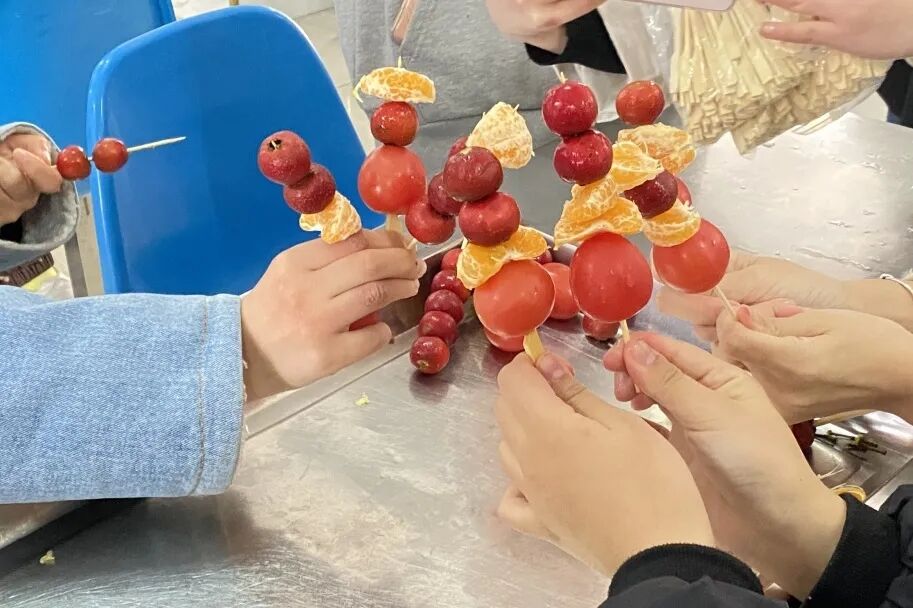 营养保健协会为同学们准备了山楂、橘子、圣女果、熟芝麻、竹签等材料,有的同学还自带了草莓、香蕉、豆沙等材料,大家根据口味喜好,自由搭配食材,发挥创意制作冰糖葫芦。健康与康复学院关工委易军副主任也亲临现场与同学们一起制作冰糖葫芦并向女大学生送去节日祝福。易军副主任鼓励女大学生独立自主,自尊自强,认真学习钻研专业技术,锤炼道德修为,以王亚平、张桂梅、陈薇等一大批优秀女性为榜样,为中华民族伟大复兴贡献“她”力量。