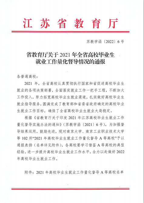 近日,省教育厅印发《关于2021年全省高校毕业生就业工作量化督导情况的通报》(苏教学函〔2022〕6号)文件,beat365被评定为“2021年高校毕业生就业工作量化督导A等高校”。