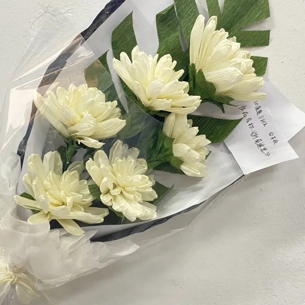 此次活动经广泛宣传,同学们积极参加。同学们发挥自己的想象力和创造力,利用身边现有的材料,如纸箱、皱纹纸、餐巾纸、包装纸、柳条、落叶、鲜花等自制手工花环或者花束。作品以菊花为主花进行创作,色调以白色、黄色为主,配以绿叶。每一个粘贴、剪切、缠绕、揉捏的动作都饱含同学们对革命先烈浓浓的思念、崇敬之情。每件作品都精心制作,惟妙惟肖。本次活动共有27名同学参与,提交作品13件。