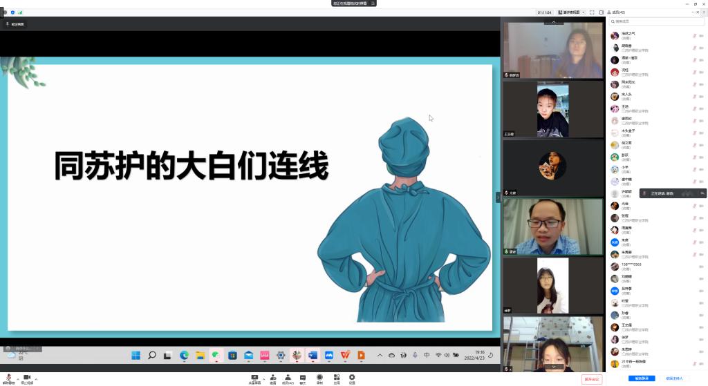 本次班会交流主题围绕弘扬伟大抗疫精神、苏护大白在行动、疫情防控校园生活、践行医学生使命四个方面开展。疫情就是命令,防控就是责任,beat36551名老师积极响应上级和学校党委号召,主动请缨,挺身而出,支援苏州抗疫核酸采样工作,为苏州疫情防控贡献力量。51名老师舍小家为大家,他们无私奉献的精神感动了参会的全体同学。班会过程中与奋战在苏州抗疫一线的谢奇老师进行了视频连线,谢老师在交流中分享了老师们在支援苏州核酸采样工作中不怕困难,克服劳累、饥饿、口渴,挑战身心最大极限等很多感人事迹。在听完老师们的感人故事后,很多同学表示“一代人有一代人的长征,一代人有一代人的使命,时代的接力棒传到我们手里,我们一定能做好自己,遵守防疫各项要求,用实际行动回报学校和老师对我们的培养和关心”。