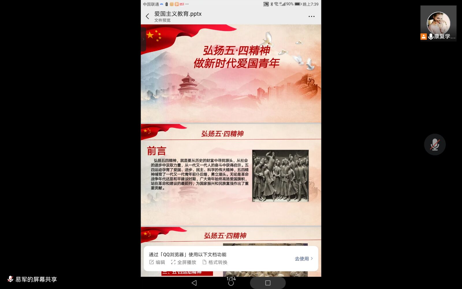 启航新征程,奋斗正当时。“五四”前夕,习近平总书记勉励青年“争做堪当民族复兴重任的时代新人,在实现中华民族伟大复兴的时代洪流中踔厉奋发、勇毅前进”。为引导我院青年学子向前辈学习、向榜样学习,4月29日,我院“喜迎党的二十大,永远跟党走,奋进新征程”“五四”主题青春故事分享会在腾讯会议进行。关工委副主任易军、学工办主任杨海涛、团总支书记赵娟、支援苏州抗疫青年教师周静及我院团学青年聆听了此次青春故事分享会。