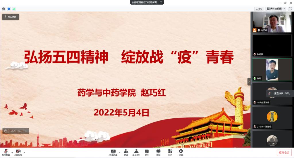 为纪念五四运动103周年,传承五四精神,激励广大青年学子传承五四精神,矢志爱国奋斗,担当青年责任,5月4日下午,药学与中药学院关工委主任赵巧红以“弘扬五四精神,绽放战‘疫’青春”为主题在线上为学院团学干部做了一场生动精彩的主题宣讲。