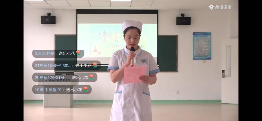 为深入开展党史学习教育,用革命先烈坚定的信念强化护理队伍建设,庆祝第111个国际护士节,歌颂白衣天使为人类健康做出的杰出贡献,诠释护理关怀、照顾和保护的核心价值观,护理与助产学院护理管理部于5月11日下午,在实训楼124隆重举办了纪念“5·12”国际护士节活动。此次活动同时以腾讯课堂直播形式进行。