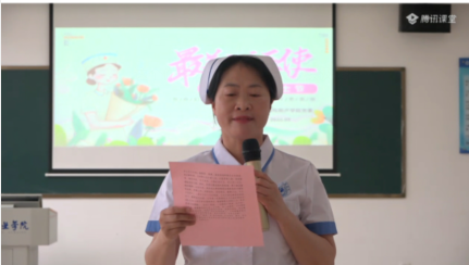 护理与助产学院党委副书记、副院长侯继丹作了总结讲话。她说,无论是在日常的医疗护理工作中,还是在面对重大传染病威胁、抗击重大自然灾害的关键时刻,广大护士都临危不惧、勇往直前,忠诚地履行救死扶伤、服务人民的重要职责。新冠肺炎疫情发生以来,护士队伍承担了大量的疫情防控和医疗救治等任务,在救治患者、提高治愈率和降低死亡率等方面做出了突出贡献。她对所有护生提出了三点希望,一是勤奋好学谦虚低调,要以谦虚的态度,踏踏实实,认真学习,要懂得保护自己、提升自己;二是要吃苦耐劳磨砺前行,坚守岗位,默默付出,在平凡中见伟大;三是坚守平凡无私奉献,一切为了患者,一切服务于患者,要用心去体验,用心去服务。