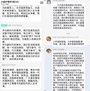 除此以外,学院各个团支部均组织班级同学学习观看庆祝大会,实习学生与驻点学生也利用休息时间观看了回放。习近平总书记的重要讲话在我院团员青年中引发热烈反响,同学们在班级群内发起讨论,纷纷表示要用青春担当激荡起民族复兴的澎湃春潮,同心同向同行为中国医疗卫生事业的发展贡献自己的青春力量。