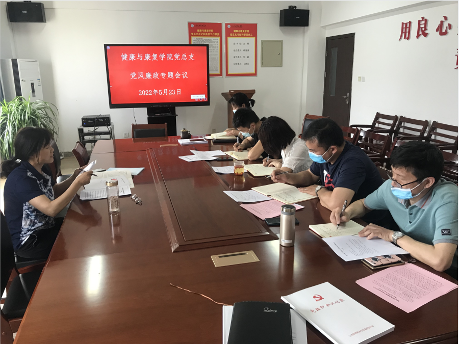 为推动落实党风廉政建设主体责任,推进全面从严治党向纵深发展,2022年5月23日下午,健康与康复学院党总支召开党风廉政专题会议,党总支委员、各党支部书记参加了会议,会议由健康与康复学院党总支负责人王朝主持。