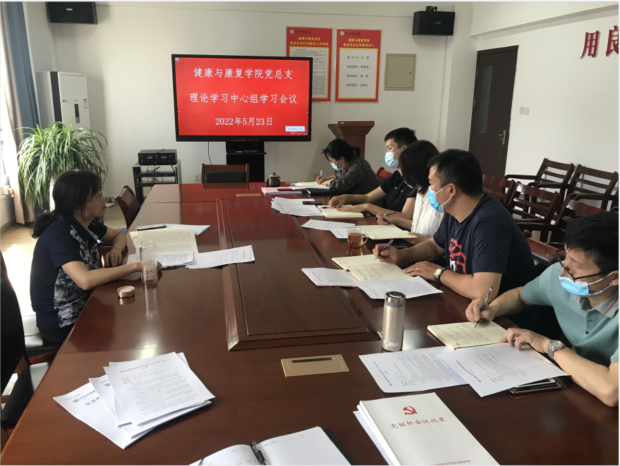 2022年5月23日下午,健康与康复学院党总支在天医星大校场·康复楼1203会议室召开理论学习中心组学习会议,党总支委员、党支部书记参加会议,会议由健康与康复学院党总支副书记王朝主持。