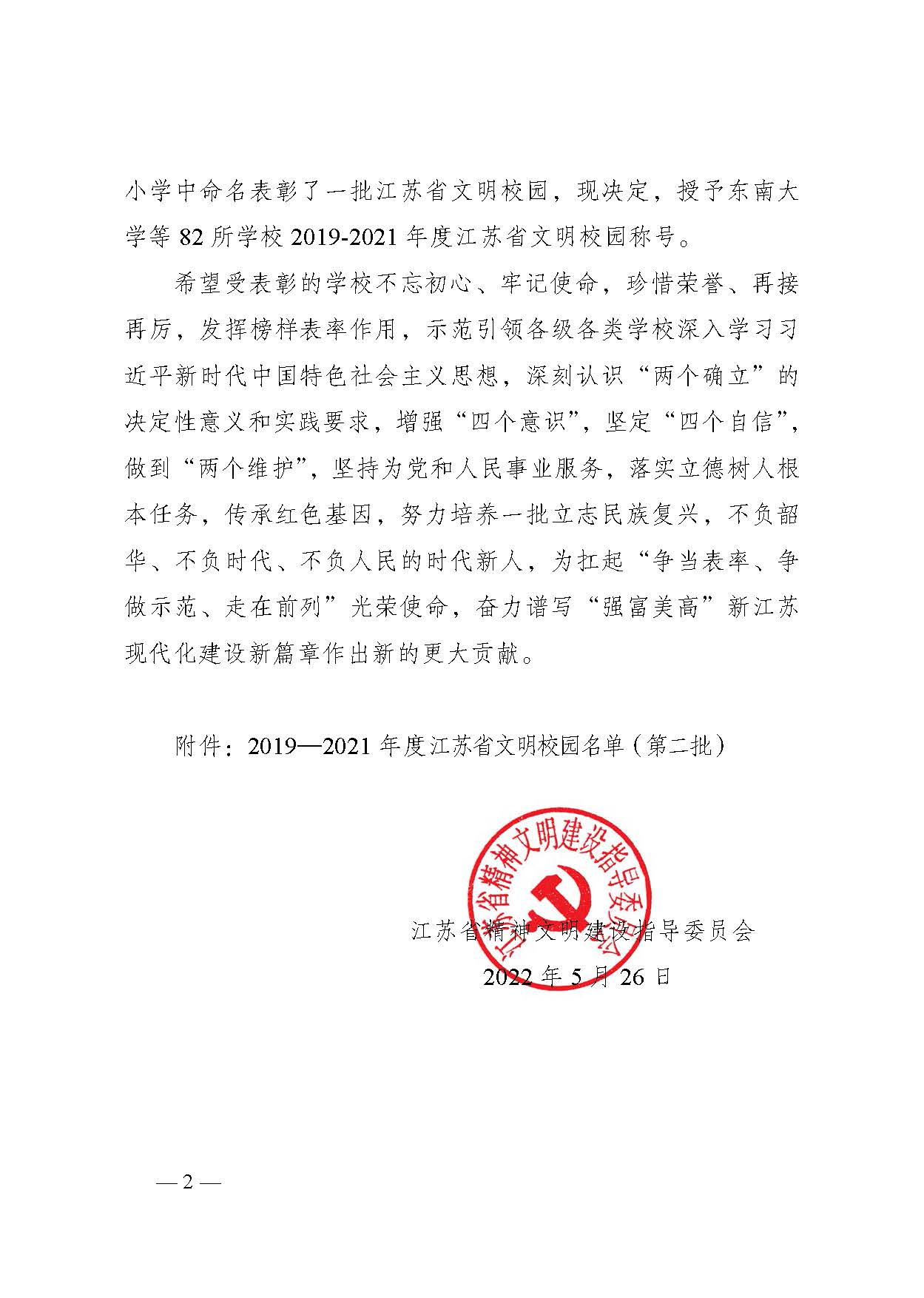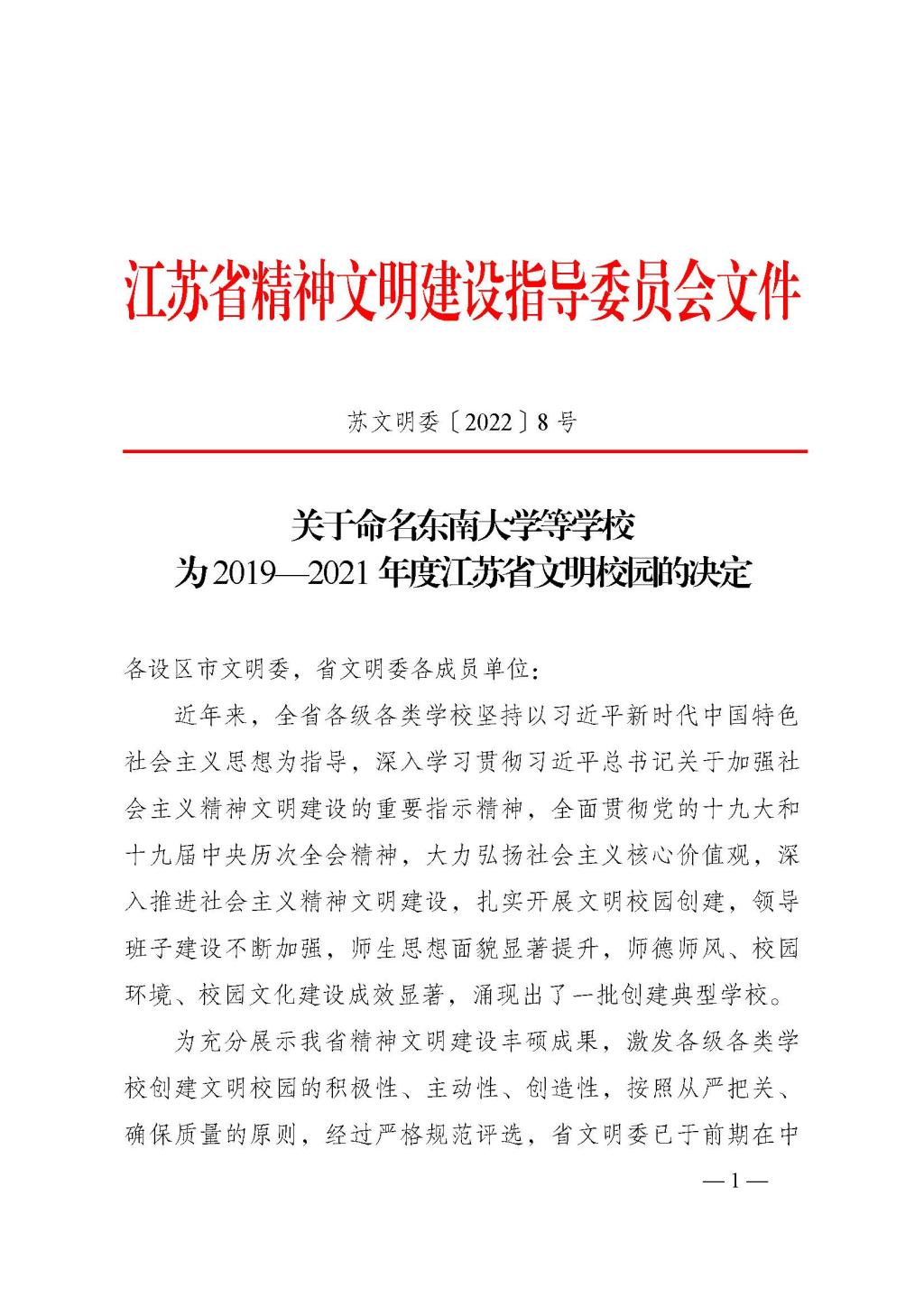 近日,江苏省精神文明建设指导委员会公布了2019—2021年度江苏省文明校园(第二批),beat365被授予“江苏省文明校园”称号。