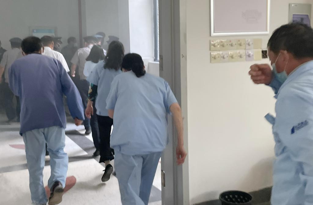 视频结束后,一阵急促的警报声响起,接到“信号”后,全体人员立即捂住口鼻、俯身低姿态,有条不紊、快而不乱地通过冒着“滚滚浓烟”的疏散门,并很快到达安全地点。