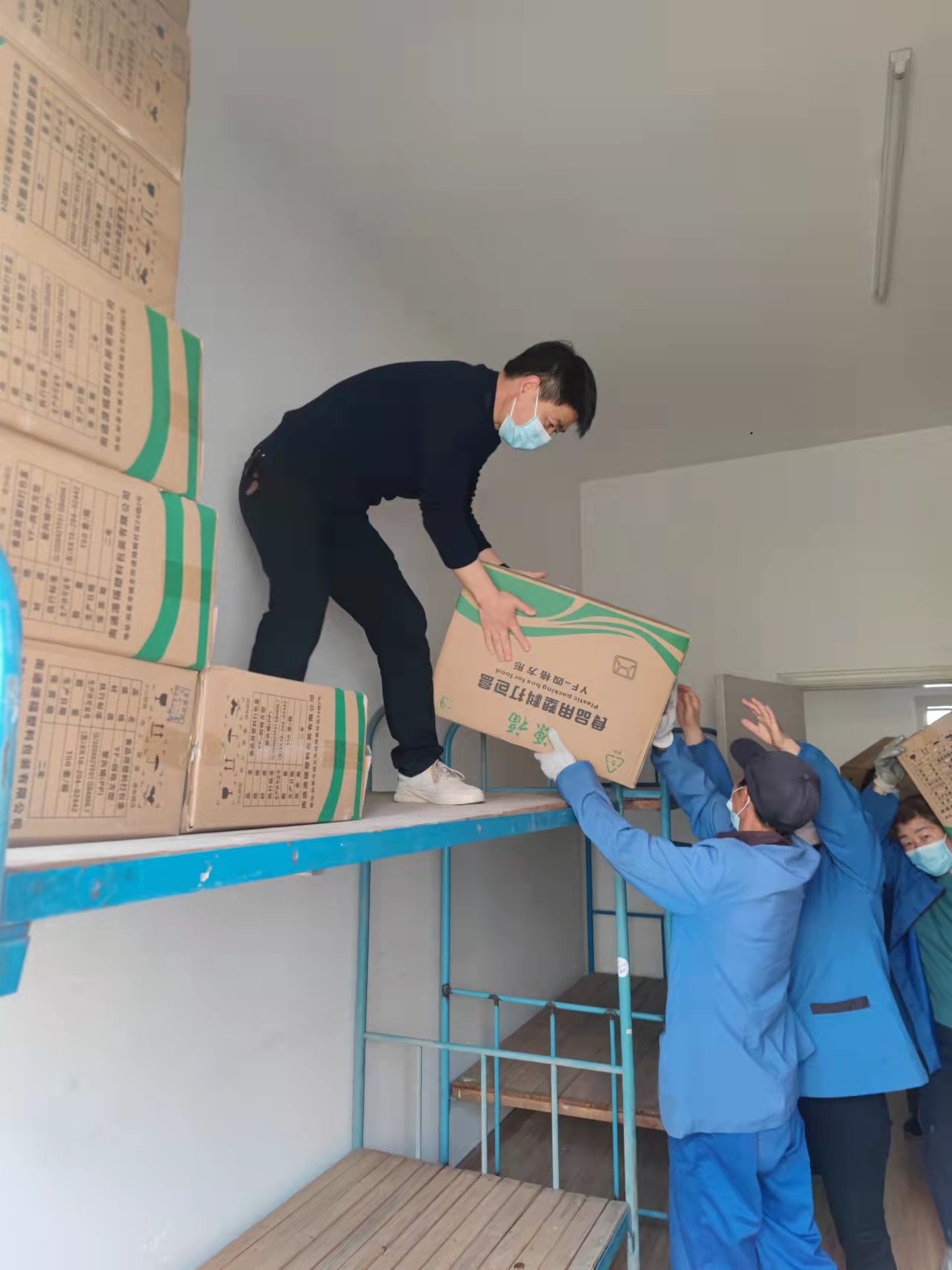 后勤保障党支部书记、饮食安全管理科科长孙鹏飞表示虽然后勤人大都没有医学专业背景,但在保障教师志愿者物资方面一定要全力以赴。在他的号召下,在校轮岗支部党员紧急行动起来,有的在仓库负责清点防疫物资,有的负责搬运、运输防疫物资,有的和超市人员一起装袋、转运生活物资,连非党员平常只负责报刊发放的王伟也进入到了这支队伍中。