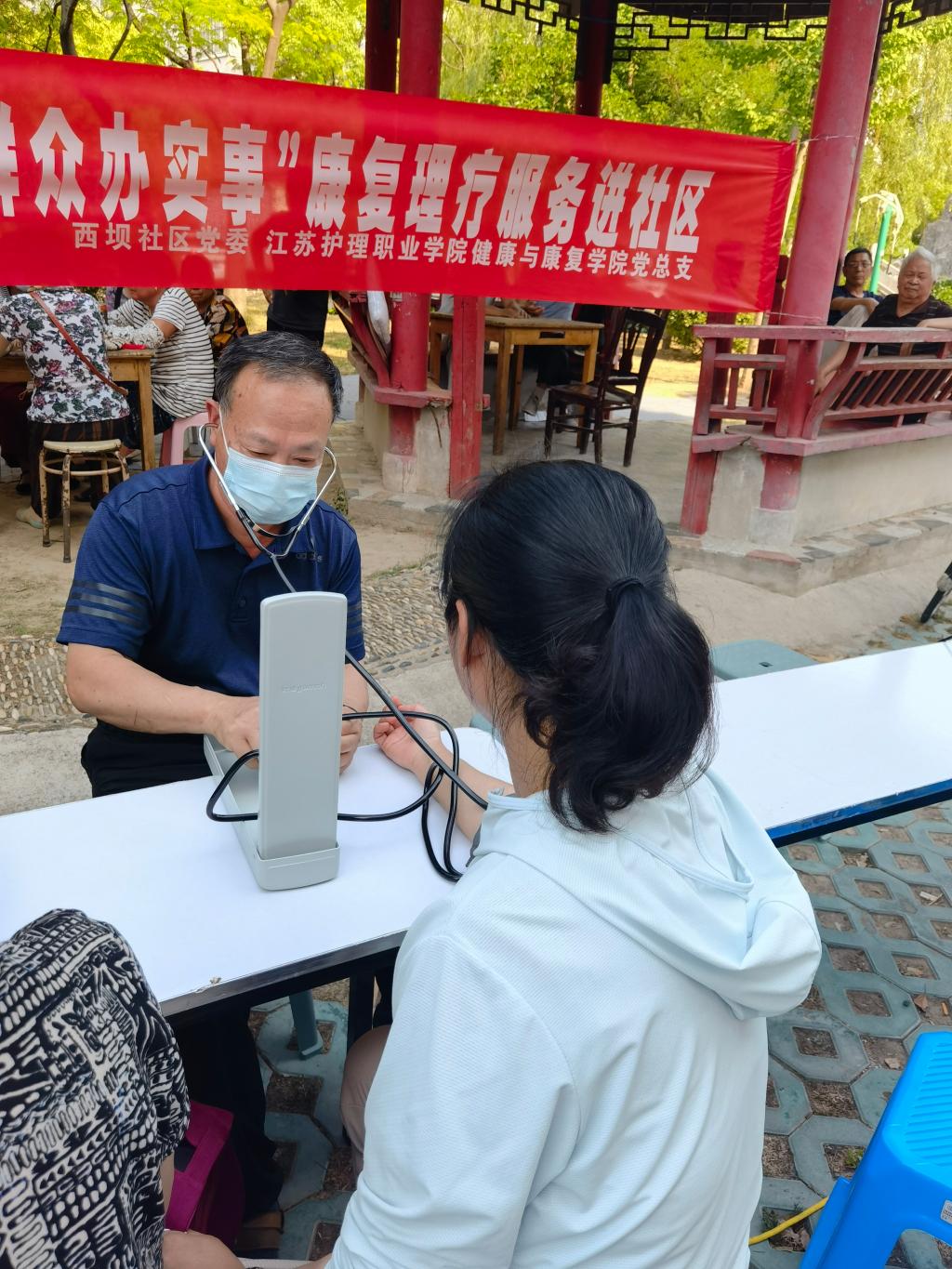 下午4点,全体党员和学生入党积极分子冒着炎炎酷暑前往西坝社区。活动中,学生为一些有慢性疾病的老年人做推拿、理疗等康复治疗,党员教师在现场为老年人听诊、把脉、量血压、做理疗。易军副主任也来到现场,为群众测量血压,耐心解答群众的问题。