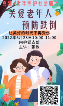 为进一步提升老年人防范跌倒意识,达到预防跌倒的目的,持续为老年人提供有温度的健康服务,为老年人构建安全环境,指导老年人掌握健康生活技能。内护党支部于6月23日上午,由张敏老师通过腾讯课堂为护理与助产学院的师生及学生亲属、社区群众开展了“让美好的时光不再受伤——关爱老年人、预防跌倒”的线上讲座。