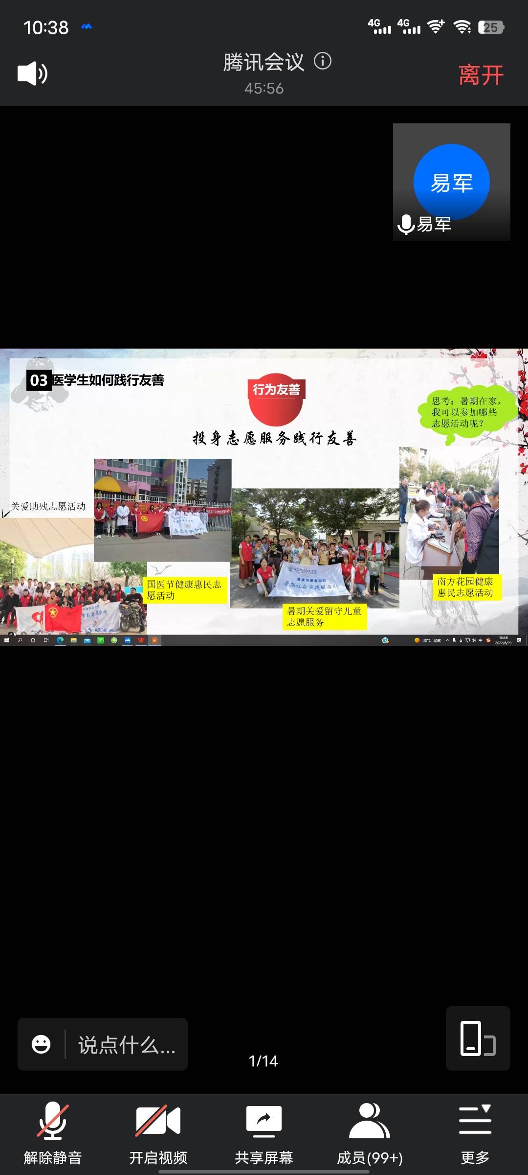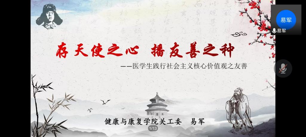 为加强大学生社会主义核心价值观教育,健康与康复学院关工委开展了主题宣讲活动。6月29日上午,健康与康复学院关工委副主任易军在腾讯会议为百余名2021级学子带来了“存天使之心 播友善之种 ——医学生践行社会主义核心价值观之友善”的主题宣讲。