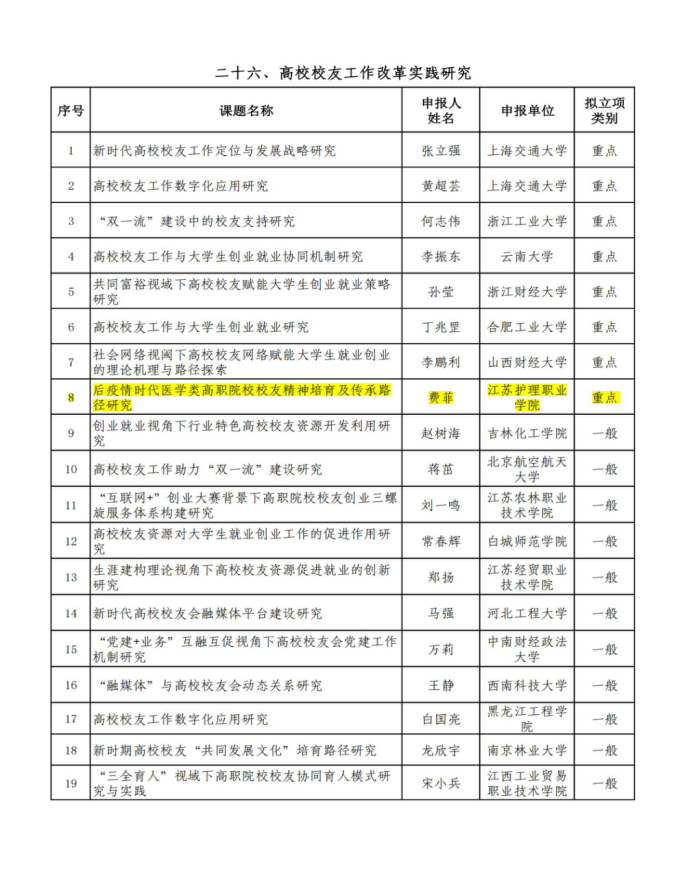 近日,中国高等教育学会公布了“2022年度高等教育科学研究规划课题”立项名单,由beat365高教所费菲副所长带领团队申报的《后疫情时代医学类高职院校校友精神培育及传承路径研究》成功获批“高校校友工作改革实践研究”重点课题。中国高等教育学会“2022年度高等教育科学研究规划课题”面向全国高校申报,其中“高校校友工作改革实践研究”类设立项重点课题仅10项,一般课题20项,beat365是唯一入选的高职类学校。