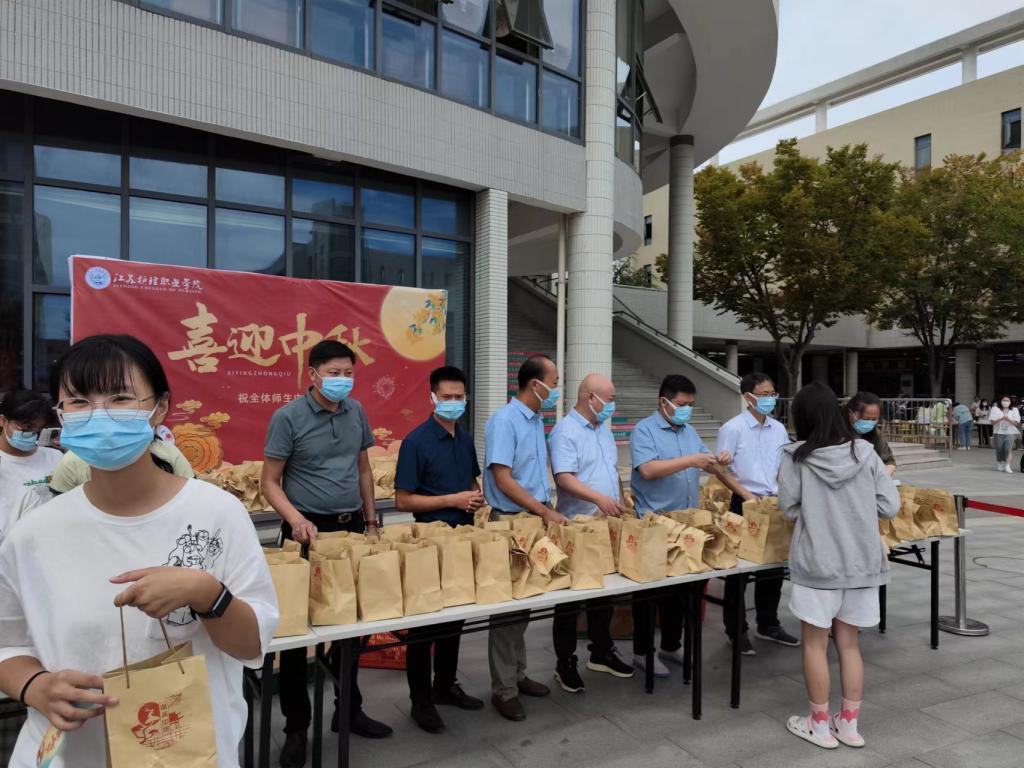 在食堂楼东门台阶下,后勤保障处一名工作人员向来领礼品的同学道上一句祝福,并把装有月饼和石榴的礼品袋热情递到一名同学手中,这名同学赶忙致谢,拿到礼品的同学喜笑颜开。