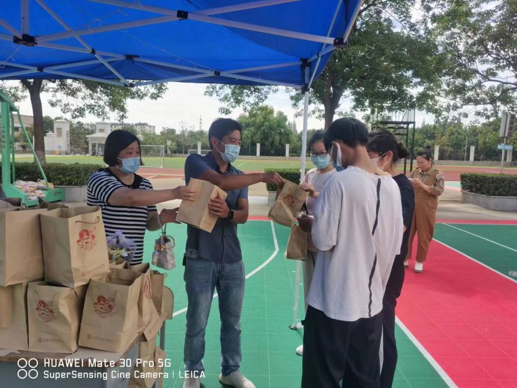 这是后勤保障处配合学校团委、组织餐饮公司摆摊设点开展的一场中秋送月饼活动,后勤保障党支部部分当日入校党员参加了活动。据了解,发月饼活动在两个校区同时举行,学工部门提前把礼品券发放到学生手中,学生凭券在中秋节当日领取一份礼品。本场活动共为在校学生发放了2406余份礼品。为了做好这场活动,后勤保障处提前积极准备,礼盒订制、挑选购买月饼均由后勤保障处负责完成。