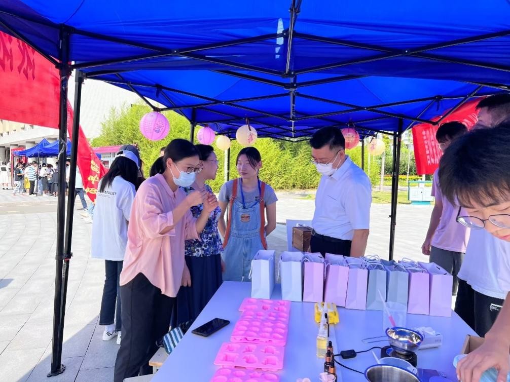 首先,校党委副书记胡海员来到药学与中药学院手工香皂和香囊制作现场,对学生们利用专业知识,发挥自己的专业特长而开展的活动给予了充分赞扬与肯定。