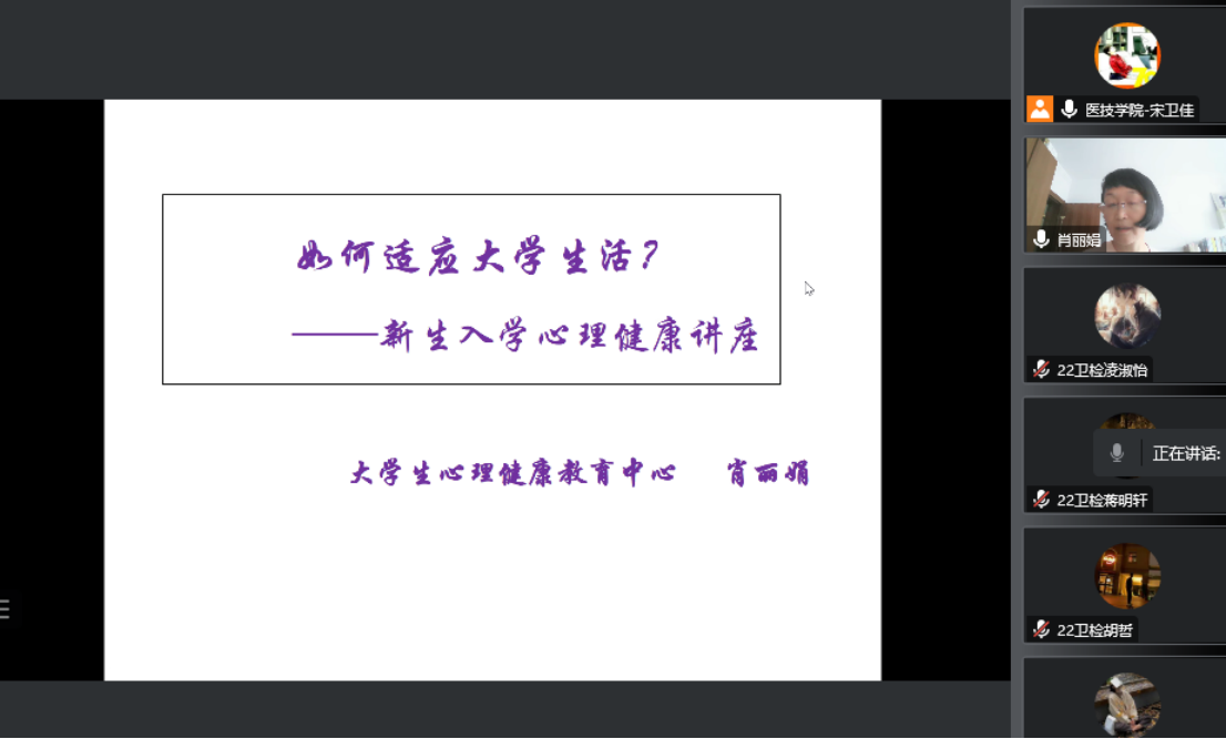校学生心理健康咨询中心的肖丽娟老师,从大学生适应与心理健康、新生适应大学生生活常见的问题、促进适应大学生生活的途径等方面带领同学们正确认识心理健康,更快地适应大学生活。