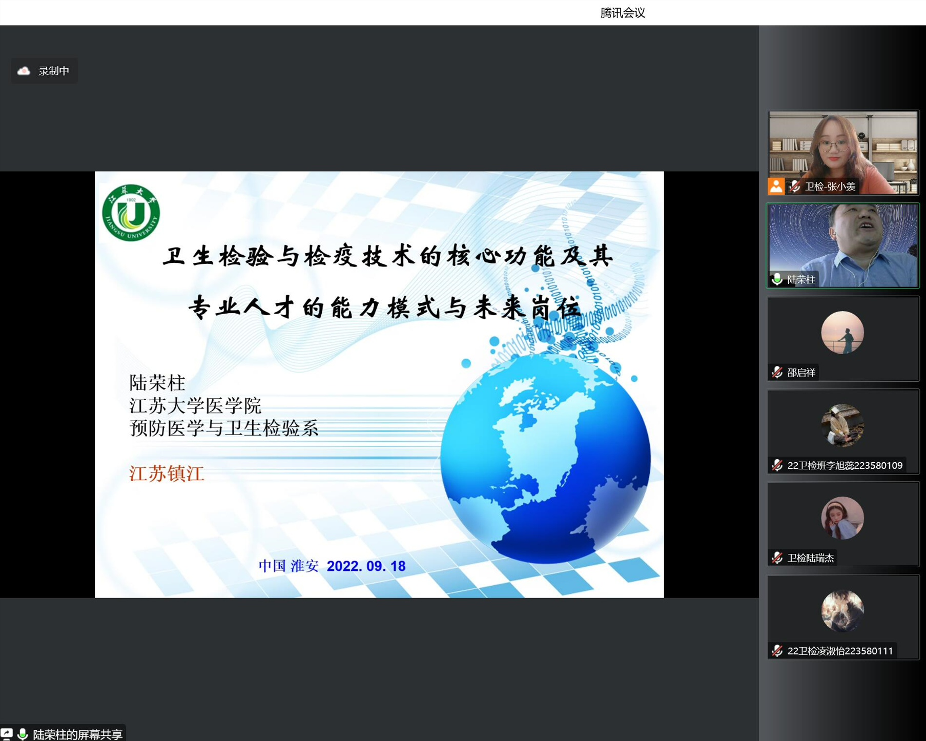 9月18日上午,医学技术学院举行2022级新生入学教育会议,特邀江苏大学预防医学与卫生检验系主任陆荣柱教授,为新生做了《卫生检验与检疫技术的核心功能及其专业人才的能力模式与未来岗位》专题讲座。
