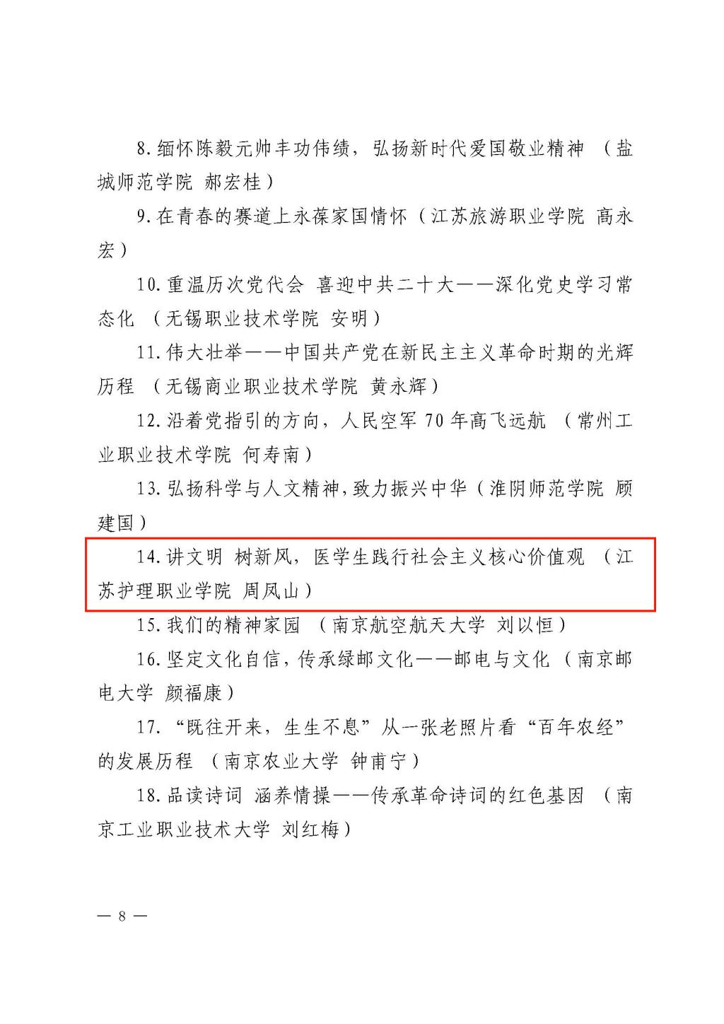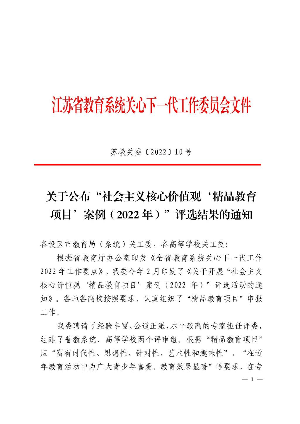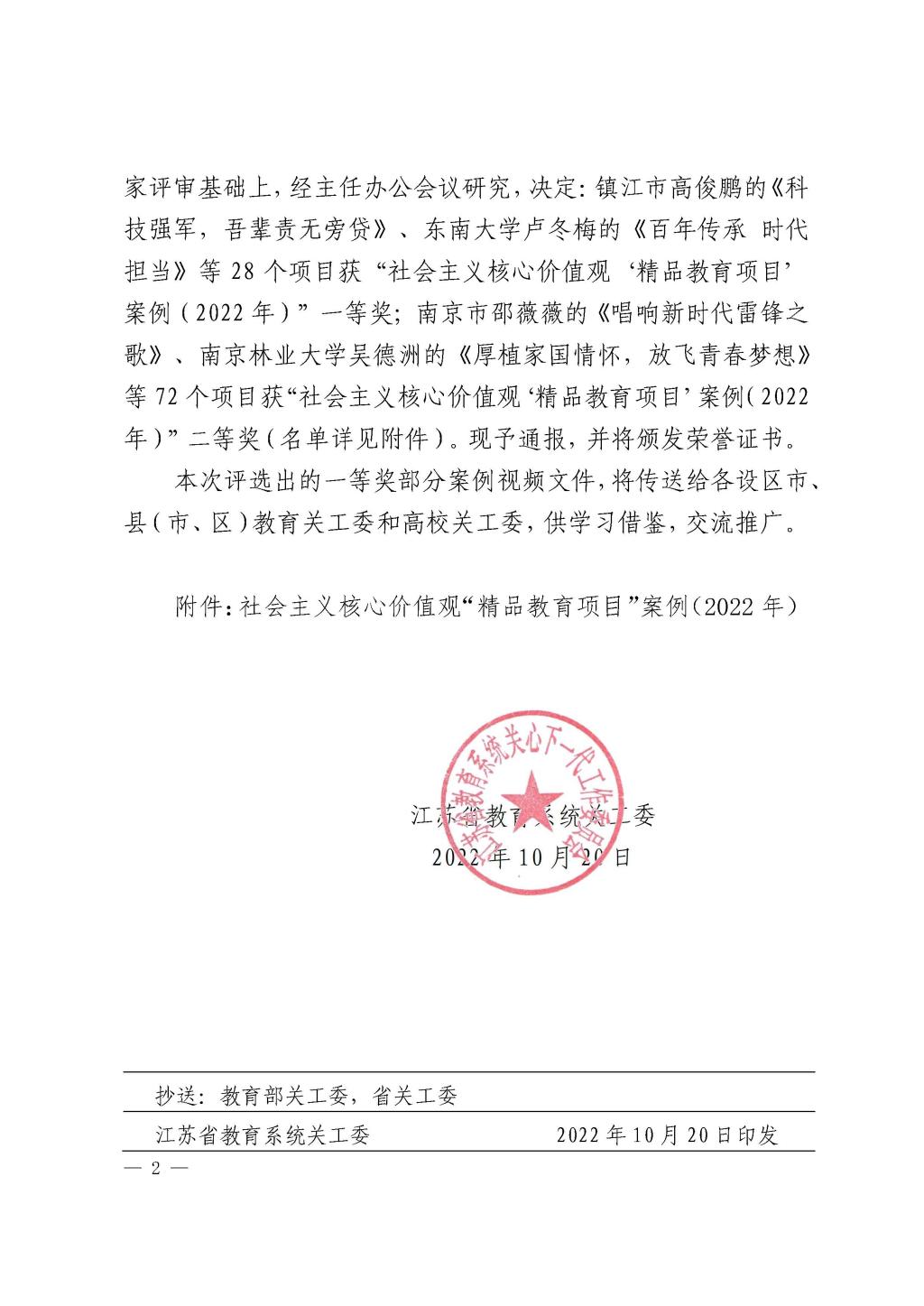 根据《关于公布“社会主义核心价值观‘精品教育项目’案例(2022年)”评选结果的通知》(苏教关委〔2022〕10 号)公示结果获悉,护理与助产学院关工委报送的《讲文明 树新风,医学生践行社会主义核心价值观》“精品教育项目”案例荣获江苏省教育系统关工委2022年度社会主义核心价值观“精品教育项目”案例二等奖。