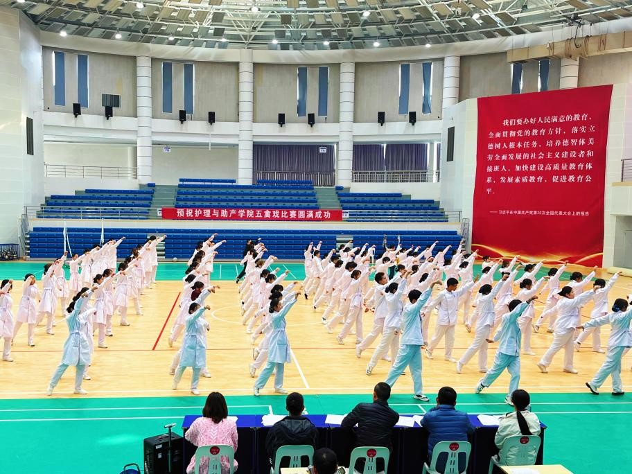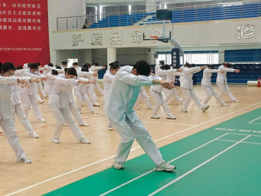 比赛前,护理与助产学院以班级为单位进行练习,班主任高度重视练习的质量和效果,深入学生一起练习,同学们的主观能动性得到充分的激发,动作学习达到了事半功倍的效果。比赛中,同学们身着统一的服装,在舒缓悠扬的音乐中,同学们将虎之威猛、鹿之安舒、熊之沉稳、猿之灵巧、鸟之轻捷模仿得形神兼备,部分班主任也上场参赛,不仅体现了护理与助产学院师生良好的精神风貌,同时也奉献了一场集健身养生、艺术欣赏、陶冶性情为一体的视觉盛宴。