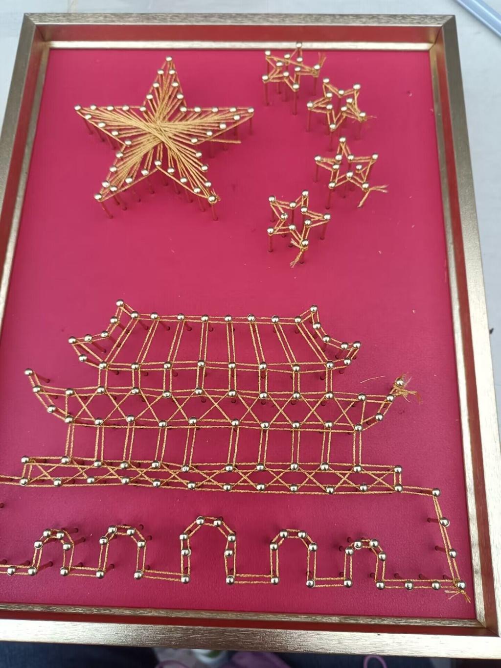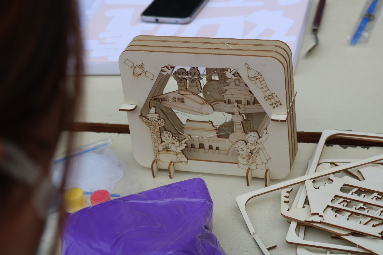 活动现场,同学们把独特的创意融入到纸浆画、钉子绕线画、3D立体拼图、石英砂画,以及超轻粘土等各种作品创作中。大家聚精会神,忙得不亦乐乎,把对党和国家的真挚感情和对未来生活的美好期盼凝聚在一件件外观精美、做工细腻的作品中。