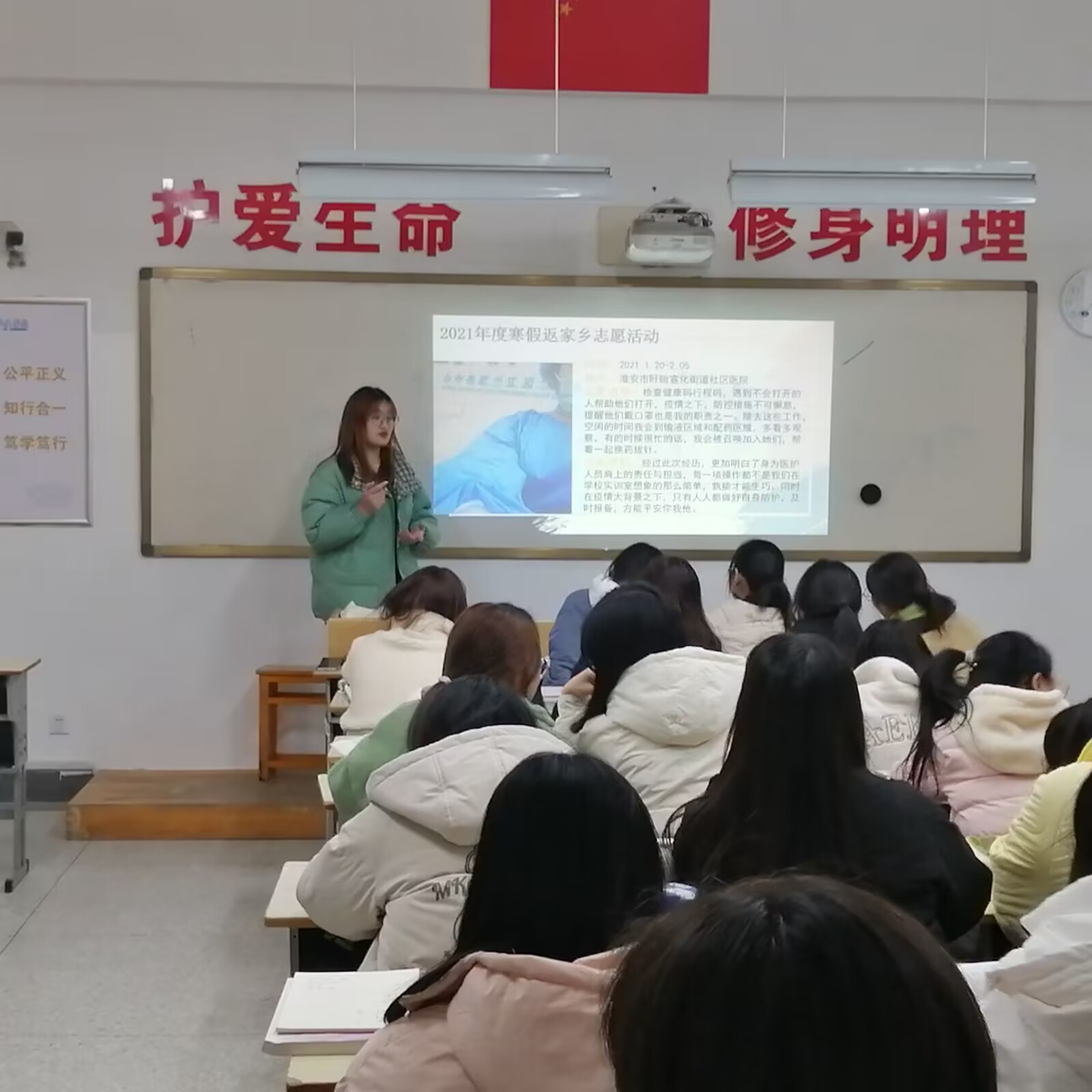 活动前,活动负责人有序分组、准备分享会相关事项并开展宣传工作。12月4日,志愿者们在教学楼404进行志愿服务经历的分享与交流,通过相互学习实现共同进步。12月5日,志愿者们利用晚自习的时间深入班级,面向2022级学生分享各自志愿服务经历,充分展示了大学生积极奉献、勇于担当的志愿服务精神。在分享过程中,同学们被志愿者们无私奉献的精神深深打动,纷纷为他们点赞。