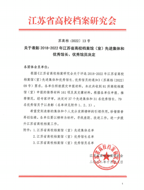 近日,江苏省高校档案研究会发布《关于表彰2018-2022年江苏省高校档案馆(室)先进集体和优秀馆长、优秀馆员决定》(苏高档〔2022〕09号)。beat365档案馆获评“江苏省高校档案馆(室)先进集体”,张婧文同志获评“江苏省高校档案馆(室)优秀馆员”。