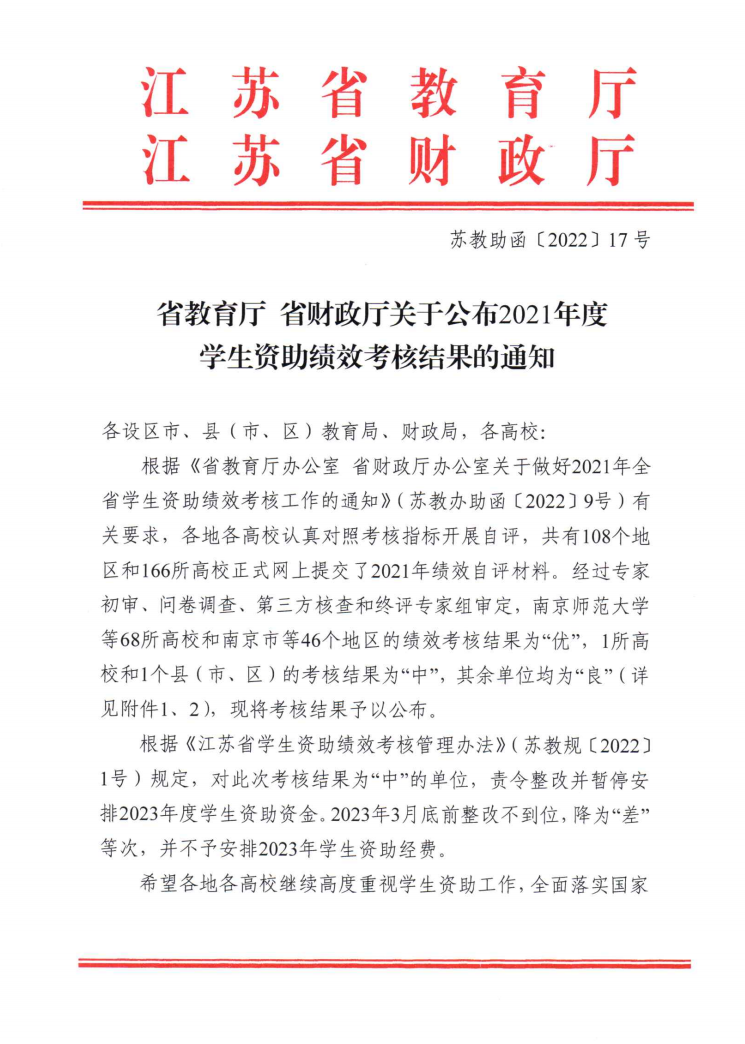 日前,江苏省教育厅、江苏省财政厅发布《省教育厅、省财政厅关于公布2021年度学生资助绩效考核结果的通知》(苏教助〔2022〕17号),beat365获评江苏省大学生资助工作绩效考核“优秀”等次。学生资助绩效考核由江苏省学生资助管理中心组织开展,每年度考核一次。此次江苏省共有166所高校、108个地区正式提交考核材料,包括beat365在内共有68所高校获评“优秀”。
