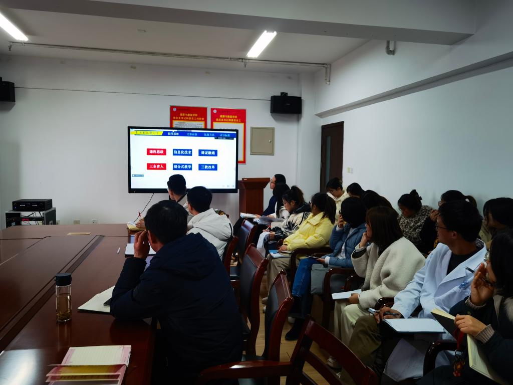 其次是选手展示环节。正在备赛的王乐政老师就《前交叉韧带损伤康复治疗》知识点作了10分钟的课堂教学展示。王老师精心设计课堂环节,赢得了全体老师的称赞。为了帮助王乐政老师改进教学,提高比赛竞争力,全体老师各抒己见,围绕主题选定、内容选取、理念设计、教学手段、教态等方面为王老师的授课展示提出了宝贵的意见。