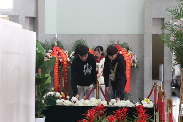 在庄严肃穆的周恩来纪念馆前,同学们怀着无比沉重的心情缅怀伟人。纪念馆瞻仰大厅内设有周总理全身汉白玉座像一尊,纪念厅的蓝色天棚可以让阳光直接射到四米多高的汉白玉坐像上,像的四周由鲜花、长春盆景簇拥,寓意着周恩来是一位顶天立地的伟人。同学们手捧鲜花向周总理塑像献花,表达对周总理的无限悼念之情和励志践行周总理崇高品质的决心。并向周恩来坐像深深三鞠躬,深切缅怀一代伟人。