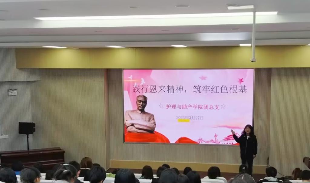 为纪念周恩来同志诞辰 125 周年,营造学生社区爱国爱党氛围,护理与助产学院团总支于2023年3月27日下午在圆阶教室组织《周恩来》集中观影活动。