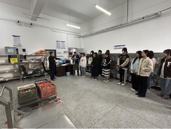 活动伊始,陈颖向全体人员介绍本次活动的目的。后勤保障部孙鹏飞老师对师生们参加后勤调研工作表示热烈欢迎。在孙老师的带领下,全体成员先后参观了食堂检测区、储存室、清洗间、切配间、消毒间、烹饪间等。参观过程中孙老师对食品原料采购验收、清洗、储存、加工、留样等各个环节以及各个操作区域的规范操作要求进行了细致的讲解并耐心解答同学们提出的问题。
