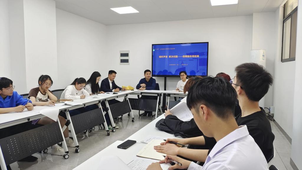 为深入贯彻落实主题教育开展调查研究的工作要求,以期倾听学生声音,查找工作不足,解决实际困难,4月,后期保障处组织人员分赴四个二级学院开展“1+1+N”后勤服务保障专题调研活动,调研的主题是:倾听声音,解决问题——保障服务零距离。后勤保障处主要负责人、科室负责人、二级学院学工负责人及学生代表参加活动。