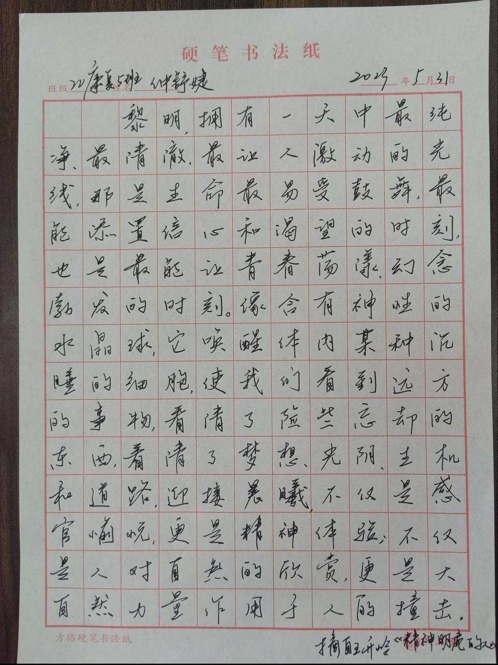 活动中,用文化传递精神,以书法展现力量,神情专注地书写每一个汉字,从横竖撇捺、起笔收笔的书写着手,软笔注重运笔,笔画流畅,字形挺拔;硬笔间架结构彰显端庄大方,颇具书法韵味;整体作品布局合理、娟秀玲珑;同学们在比赛中交流书法文化,提高同学们参与汉字文化的满足感,从而更好地领悟书法的强大魅力,增强文化自信。