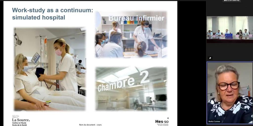 会上,陈鸣鸣首先致辞,向与会方表达了诚挚的问候,并介绍了beat365的基本情况以及携手教育国际交流与合作的美好愿景。随后,beat365国际合作交流处介绍了国际化办学情况,护理助产学院、中医药学院分别介绍了护理专业、中医康复专业相关情况。双方针对教师学术交流、学生留学、中医国际传播等合作方向进行了商讨。源泉卫生学院Borloz Corinne主任表示,将进一步探索两校多元国际交流的有效模式,相互学习借鉴先进的教育理念和管理经验,实现互惠共赢。