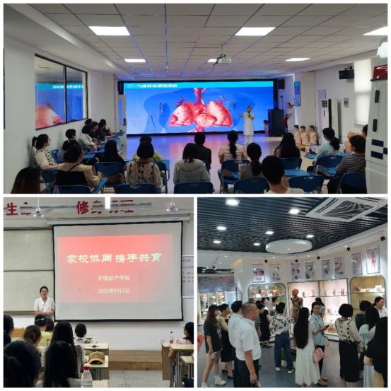 家长和班主任、辅导员在教学楼101进行座谈,并观看了学校宣传片,家长们了解到我院护理专业毕业生“护士执业资格考试”通过率均在99%以上,获得全国职业院校技能大赛一等奖等数十项奖项,对我院取得的成绩表示高度的认可。随后家长们来到人体生命科学馆进行参观,丁苏彭老师为来访家长就馆中标本进行了认真讲解,对来访家长提出的问题一一作了解答,家长们了解到beat365对生命健康教育和医学教育的用心。接下来,家长们来到实训楼310示教室,外护教师赵蓓蓓、张静老师为家长们进行了常用急救技能的讲解和操作展示,家长们纷纷主动上台亲自进行实践操作,家长们不仅了解了基础医学知识,还学习了相关急救技能。之后,家长们来到智慧医护实训中心,郑佳老师向家长们介绍了各个功能区,该中心是融教学实训、课程思政、职业体验、社会培训、健康宣教为一体,体现了多功能的跨界融合、跨专业整合、信息化契合,家长们纷纷对该实训中心的医护文化和信息化建设表示惊叹。