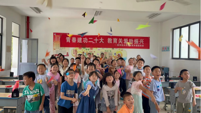 教育关爱服务团带来的“多彩活动”点燃了留守儿童的学习兴趣。现场活动中,孩子们参与“奇葩说”法律知识小课堂,深入了解《中华人民共和国未成年人保护法》的重要内容;岳飞璇同学带来的趣味化学实验让孩子们在实验中探索科学的奥秘;裴子娜同学组织孩子们手工折纸、趣味黏土,让他们动手动脑,培养创造力;绘画、音乐、舞蹈等艺术类兴趣课让孩子们释放天赋,而趣味体育运动则激励孩子们在运动中健康成长。刘鑫婕同学表示:“很开心可以带领这群孩子们做游戏,锻炼身体,希望他们可以做到‘野蛮其体魄,文明其精神’,健康快乐的成长。”社会实践队员们用深入浅出、易于接受的教学模式,帮助孩子们接受新鲜的概念,将支教课程的育人作用最大化。