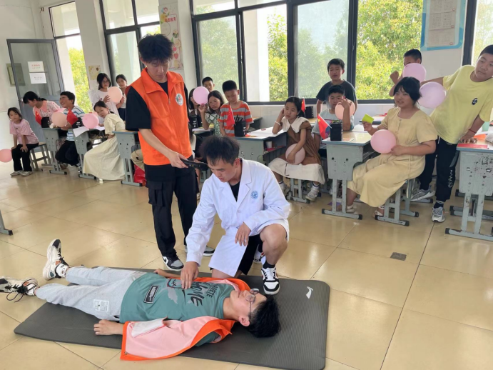 社会实践队员们发挥自身专业优势,利用扎实的医学理论知识以及实践经验为孩子们开展“医疗健康”专项教育宣讲,教育关爱服务团成员进行防溺水宣传活动,致力于传播防溺水的重要知识,为孩子们假期的生命安全多加一道保险。此外,宋金泽带领同学们开设急救知识小课堂,结合学院特色,现场为孩子们讲解“心肺复苏术”“海姆立克法”“绷带包扎法”等急救知识,让他们在关键时刻知道如何自救、互救,同时邀请了孩子们亲自体验操作急救动作要领。同时,教育关爱服务团开展了心理健康课程宣讲,利用团体心理辅导,为孩子们提供情绪释放和心理调适的途径,促进他们的身心健康发展。
